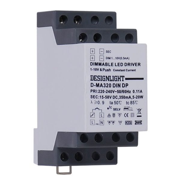 Dimbart drivdon från designlight, för montage på DIN-skena. Dimbart 350mA drivdon som ljusregleras med 1-10V eller Push. Vid montage av flera drivdon intill varandra på skenan, håll en halv moduls avstånd för att motverka värmeutveckling. Det går att bygla flera don med varandra.