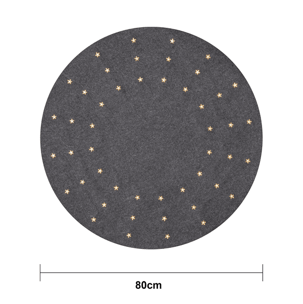 En Grå granmatta med diameter 80cm. 48 st varmvita LED lyser igenom de genomskinliga stjärnorna som sitter i mattan. En vacker dekoration att ha under granen.
